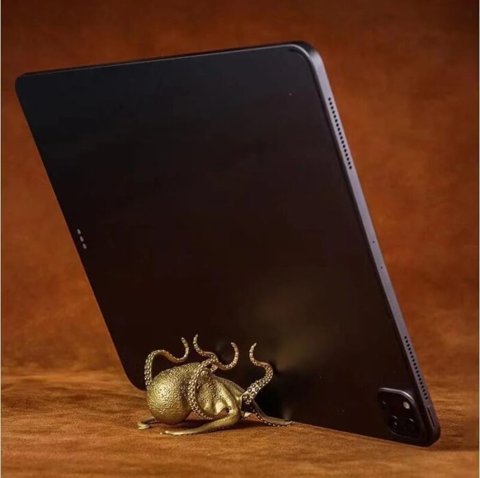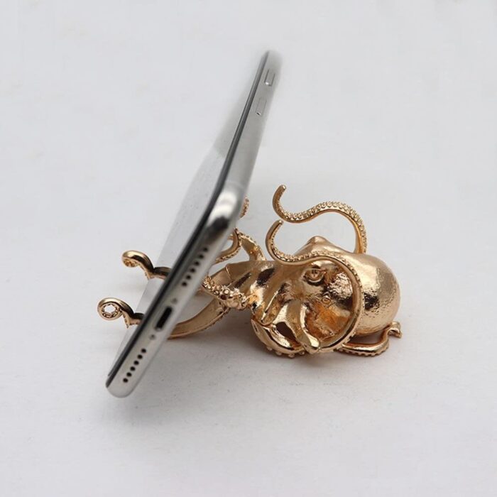 Crafted with attention to detail. this gold octopus phone holder showcases the intricate features and playful nature of this fascinating sea creature. Its tentacles are designed to securely hold your phone in place. allowing you to enjoy hands-free viewing of videos. video calls. or simply keeping your device within easy reach.