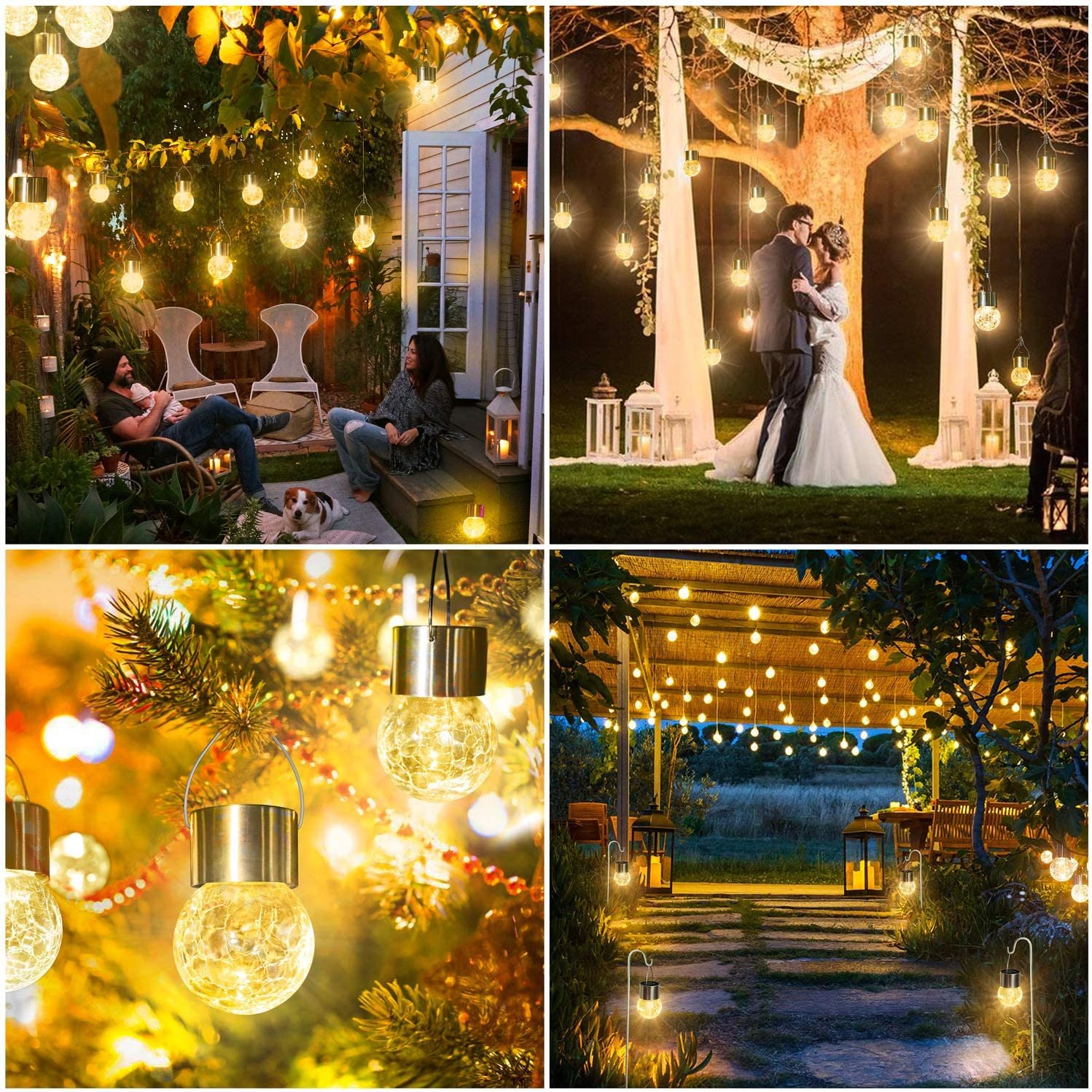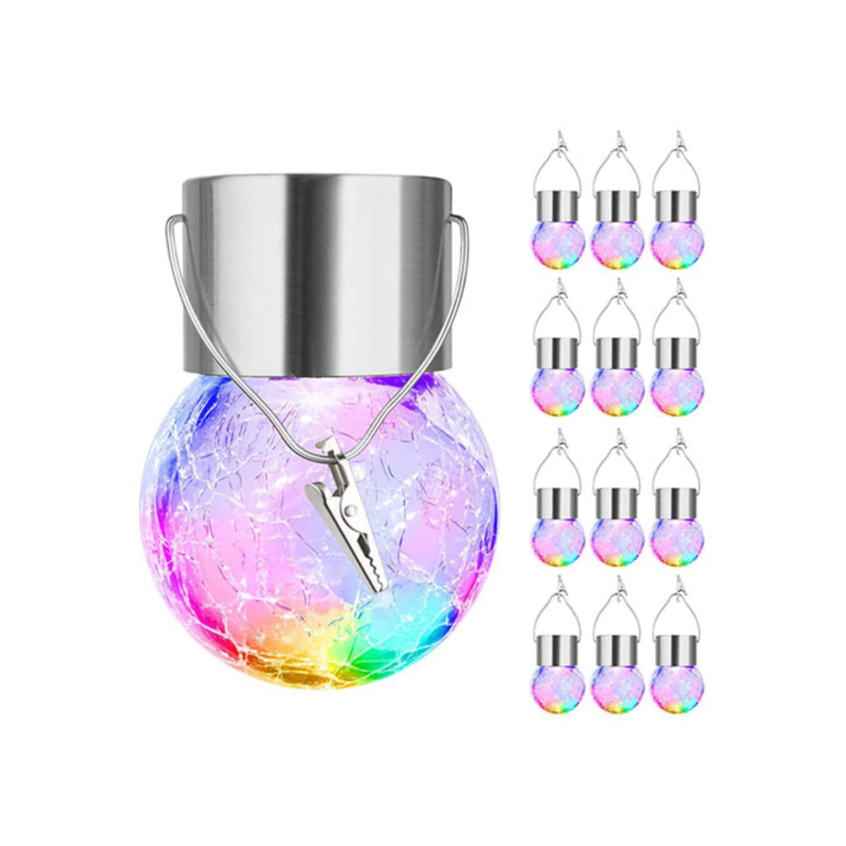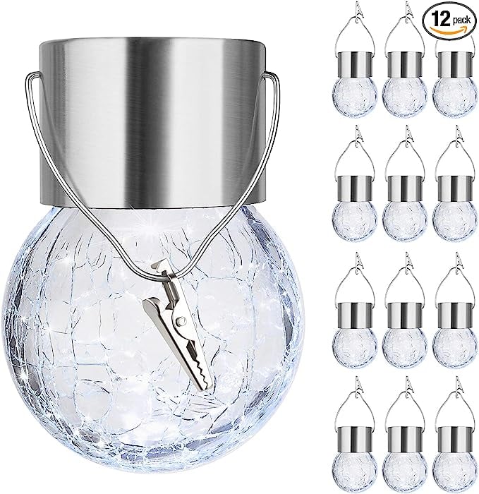 The 12-pack multicolor or warm white crackle glass hanging lights perfectly blend aesthetics and technology. Each LED light is powered by solar energy and not connected by a cord. making it easy to turn them anywhere you like. These crackle glass solar lights can add ambient colored light to your home. tree branch. Christmas tree ornaments. back yard. campground. or patio umbrella around the perimeter. etc.