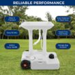 Features: – High-Density Polyethylene Construction – Stands Years of Use – Easy to Assemble – Self-Contained Bottom Fresh Water Tank – Foldable Metal Handle with Two Suoer Large Wheels on the Bottom Tank – Drainage Hose Length: 2.7′ ft.